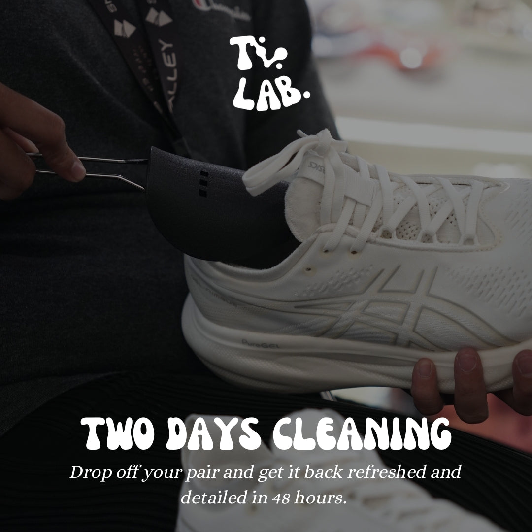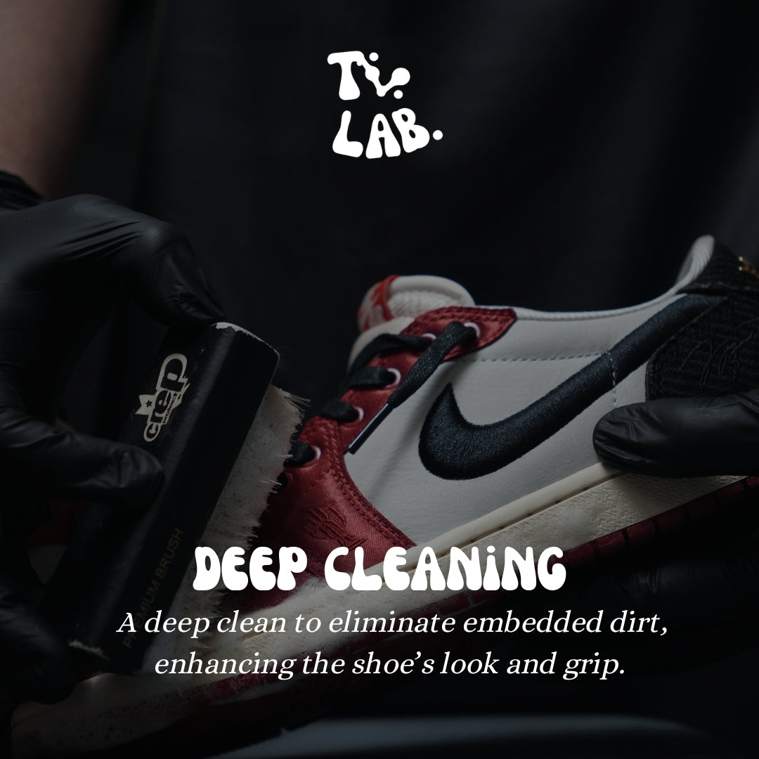 A thorough deep clean to eliminate embedded dirt, refresh materials, and enhance your shoe’s look and grip. Our process also includes odor removal, dust elimination, and a full refresh—so you can pick them up looking clean and smelling fresh!
