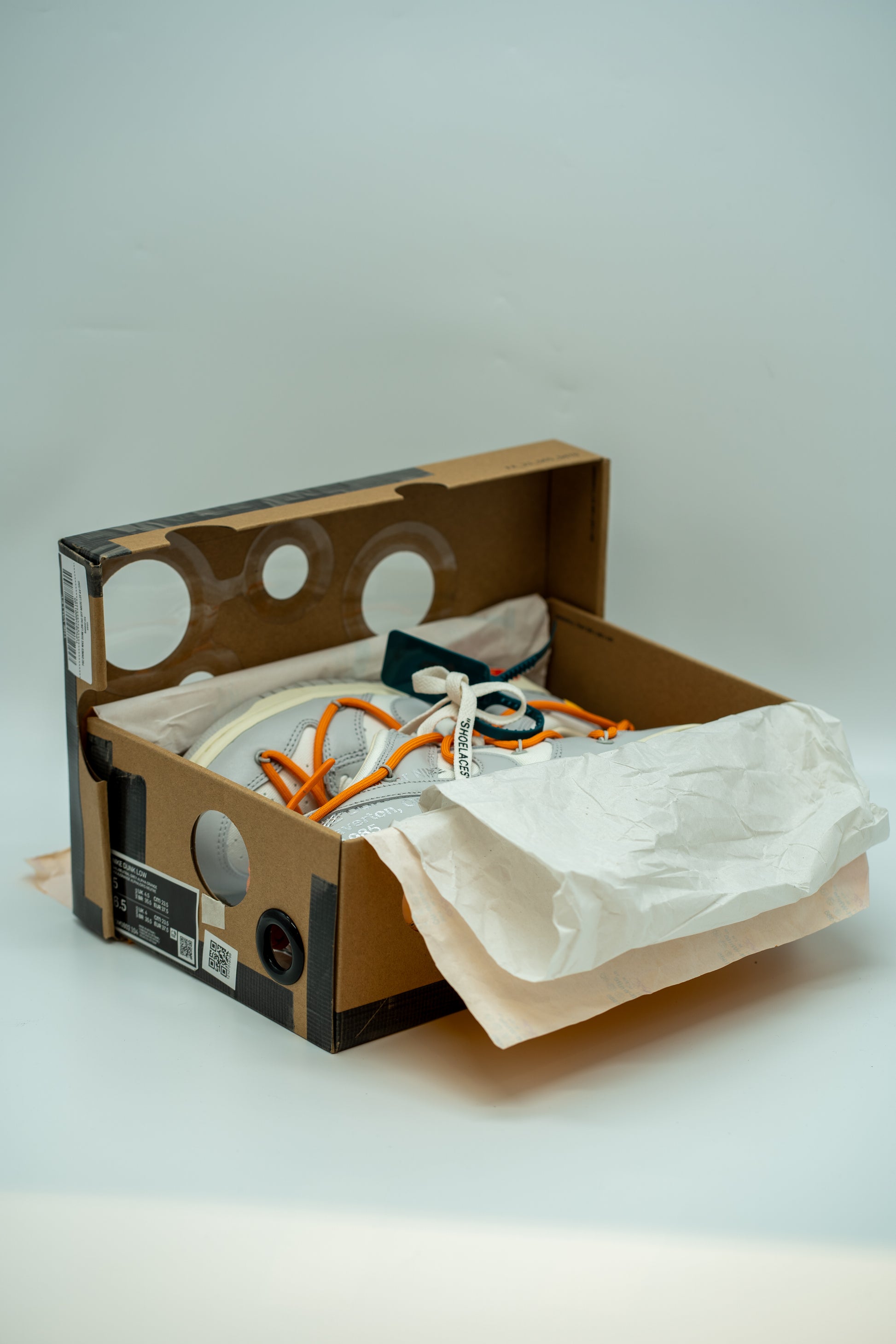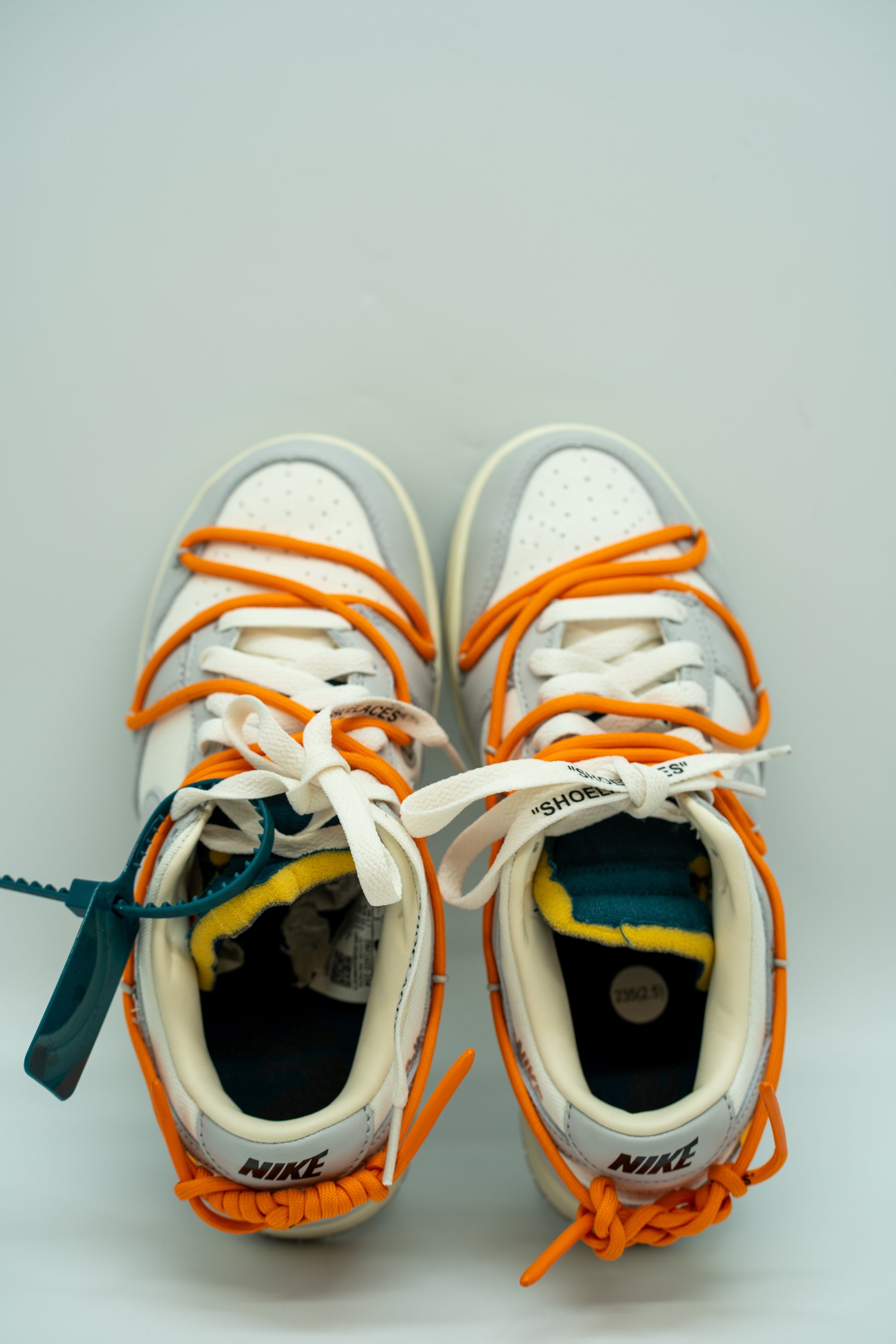 The Nike Dunk Low Off-White Lot 44 represents the collaboration between Nike and the late fashion icon Virgil Abloh. This sneaker displays a Sail and Neutral Grey color scheme with striking Alpha Orange accents. Designed with a padded collar and a lightweight foam sole, it offers excellent cushioning and support for daily wear. The durable rubber outsole ensures traction and grip on diverse surfaces, featuring a herringbone pattern for enhanced stability. Both sides boast the iconic Nike Swoosh, while the Lot 44 branding is elegantly showcased on the sole, embodying the unique touch of this collaboration.