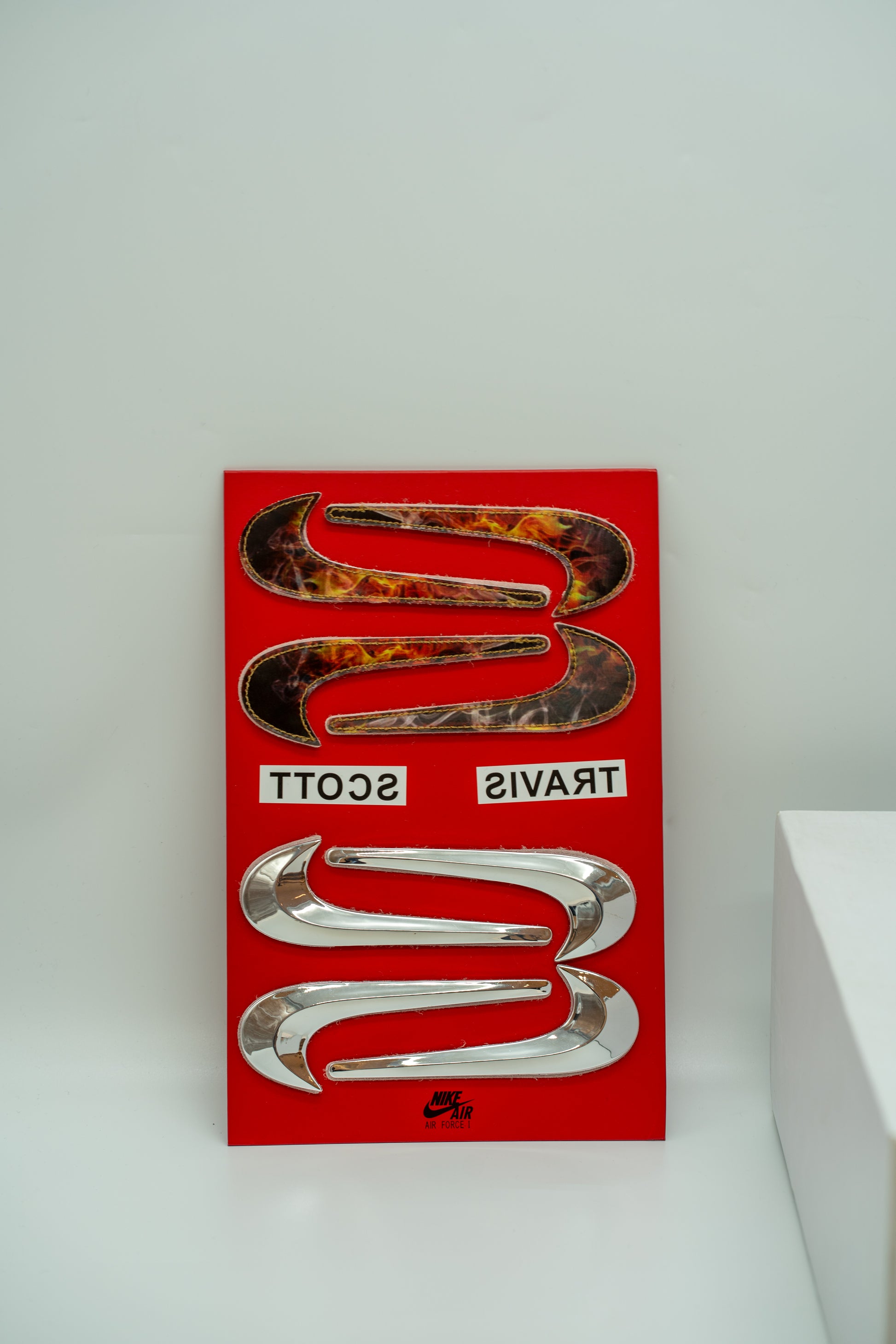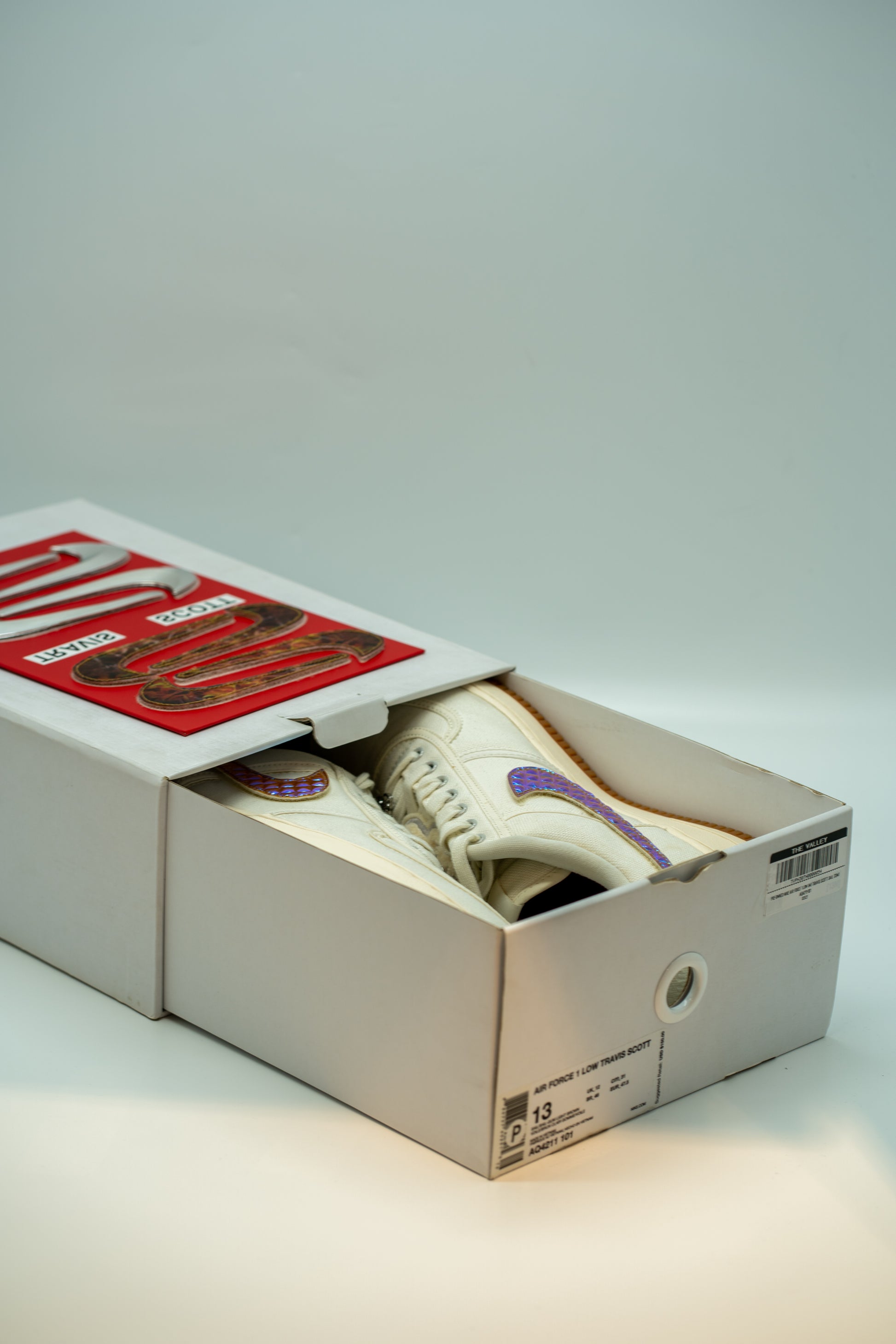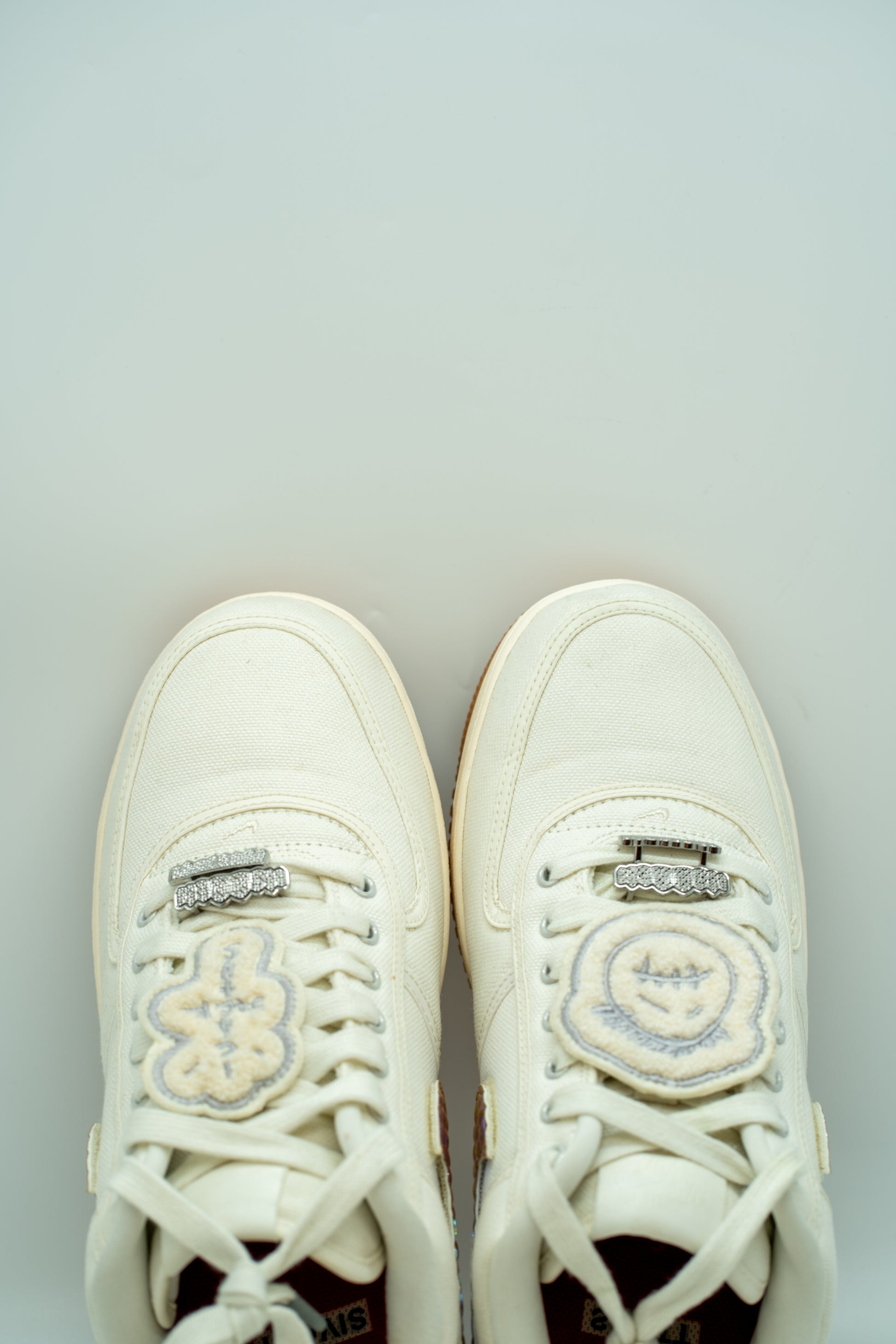 his time, the Swoosh teams up with Travis Scott on a new colorway of the Air Force 1 Low silhouette. Similar in many aspects to its predecessor, this model showcases a sail canvas upper with reinforced stitching. However, the standout features are the chromed-out Nike Swooshes on both the lateral and medial sides and the prominent Cactus Jack patch atop the laces. The shoe is rounded off with a crisp gum bottom, adding a clean finishing touch.
